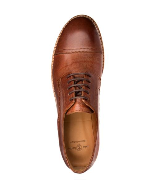 Klassischer 5-Loch Frontkappen Damenhalbschuh mit offener Schnürung. Der Derby ist aus hochwertigem vegetabil gefärbtem Kalbsleder und einem geschmeidigen Kalbsleder Innenfutter. Eine leichte Lochung verziert die beiden Ränder der Seitenblätter entlang des Derbybogens.