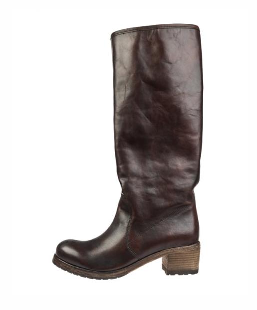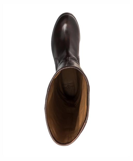 Dieser Stiefel ist aus einem changierenden rotbraunem Kalbsleder produziert und hat einen durchgehenden kniehohen Schaft, der entlang der Wade hochgezogen wird. Die runde nach oben gewölbte Frontkappe und die offensichtliche Sprengung, die einfachen Linien und der glatte Schaft vervollständigen diesen schlichten und dennoch bemerkenswerten Damenstiefel.
