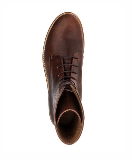 Diese elegante Schnürstiefelette mit schmaler Silhouette zeichnet sich durch ihren hohen Schaft aus, der mit Ziernähten einen raffinierten Look erhält. Das Obermaterial ist aus robustem, vegetabilem Rindsflankenleder in dunklem Cognac gefertigt, innen sind die Schuhe mit Kalbsleder gefüttert. Der kleine Absatz und die gummierte Ledersohle bieten angenehmen Tragekomfort. Die Schuhe kommen in einem praktischen Aufbewahrungsbeutel. Handgefertigt in Portugal.