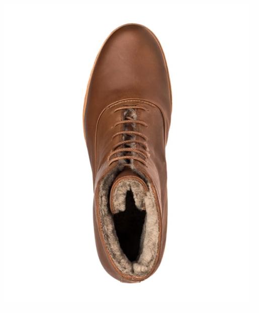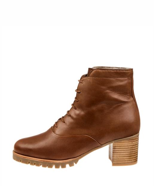 Mit dieser Schnürstiefelette bist du für jedes Wetter und jeden Weg stilvoll gerüstet. Das weiche Lammfell hält kuschlig warm und die dicke Profilsohle gibt festen Halt. Das elegante Design ist aus feinem Ziegenleder in warmem Cognac gefertigt. Für charmante Höhe sorgt der 6,9 Zentimeter Blockabsatz aus Leder, der ebenfalls mit einer Gummisohle überzogen ist. Die Schuhe kommen in einem praktischen Aufbewahrungsbeutel. Handgefertigt in Portugal.