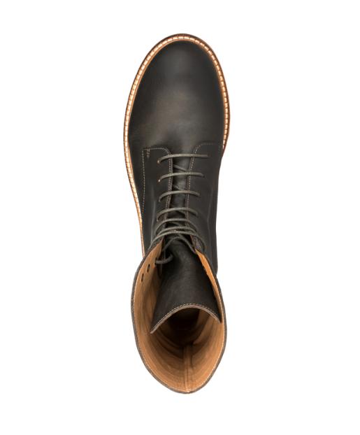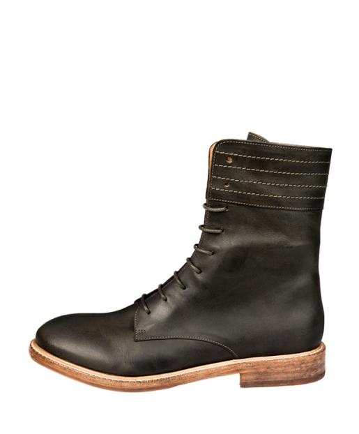 Diese elegante Schnürstiefelette mit schmaler Silhouette zeichnet sich durch ihren hohen Schaft aus, der mit Ziernähten einen raffinierten Look erhält. Das Obermaterial ist aus robustem Rindsleder in dunklem Olive gefertigt, innen sind die Schuhe mit Kalbsleder gefüttert. Der kleine Absatz und die gummierte Ledersohle bieten angenehmen Tragekomfort. Die Schuhe kommen in einem praktischen Aufbewahrungsbeutel. Handgefertigt in Portugal.