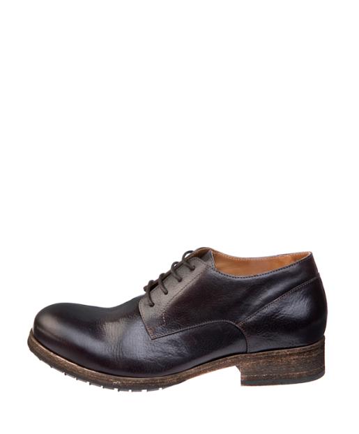 Plain Toe Derby mit runder Vorderkappe im 20er-Jahre Stil aus gewachstem vegetabilem Kalbsleder, das mit braunen Wachsen behandelt und gebürstet wurde.