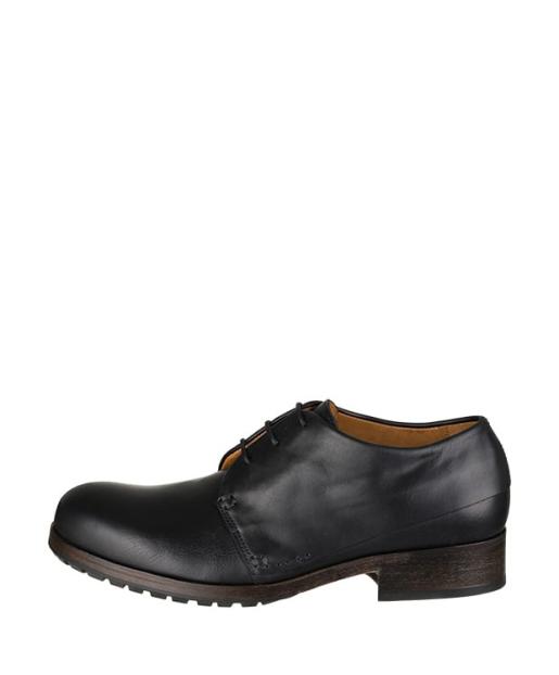 Geschwungener 3-Loch-Schnürschuh Derby aus geschmeidigem vegetabilem Kalbsleder mit einer klaren, einfachen Linie. Die schwarze Oberfläche hat durch eine besondere Bürstentechnik dunkle Schattierungen, dessen glänzende Patina mit der Zeit matter wird. Am Einstieg wurde der Lederlappen umgestülpt und hat dadurch keine Naht. Ein Stoffband ist unterhalb des Lappens angebracht und hält das Leder in Form.
