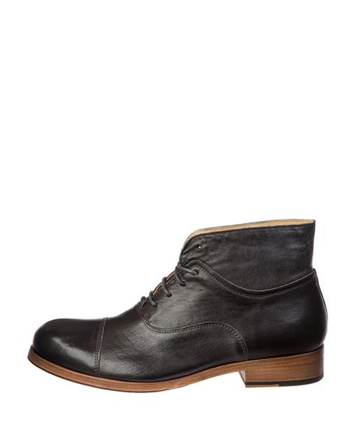 Derby – Stiefelette mit 4-Loch Schnürung aus vegetabilem Kalbsleder und Vintage-Effekt im Stil der 20er Jahre. Diese knöchelhohe Stiefelette ist optisch in vier Lederpartien eingeteilt, die in geschwungenen Linien die eher rustikale Formgebung geschmeidiger machen. Die Farbe wurde zum Schluss aufgetragen, was zu einem individuellen Farbverlauf führt.