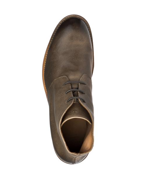 Eine klassische Plain Toe Derby Stiefelette mit flach zulaufender Frontkappe aus vegetabilem Kalbsleder, das gewachst wurde und somit eine geschmeidige und doch griffige, seidenmatt glänzende Oberfläche bekommt, welche durch das Tragen eine eigene Patina erhält. Runde Schnürsenkel schnüren die 3-Lochleiste.