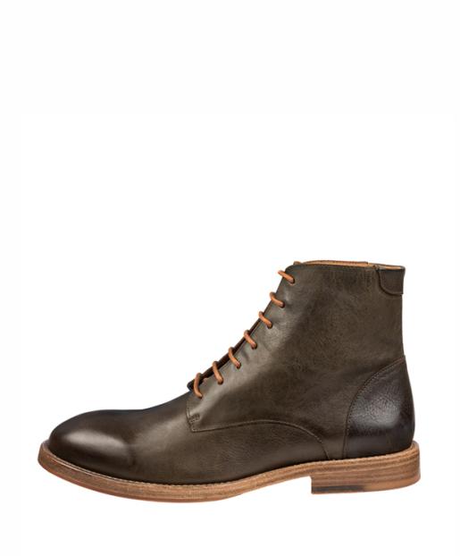 Eine klassische Plain Toe Derby Stiefelette mit flach zulaufender Frontkappe aus Kalbsleder, das gewachst wurde und somit eine geschmeidige und doch griffige, matt glänzende Oberfläche bekommt, welche durch das Tragen eine eigene Patina erhält. Runde Schnürsenkel schnüren die 7-Lochleiste.
